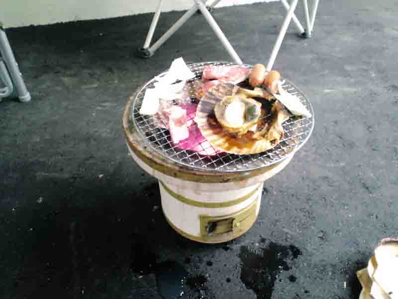 ・ヒモが縮んで全体に火が通るまでしばし待つ。(待ってる間に上側の貝殻が外れることもある)