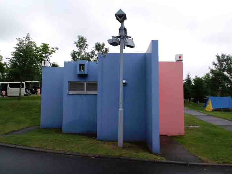 トイレ:サイトの両端のほうに各1棟ずつ。水洗できれい。このほか管理棟のトイレも24時間利用可能。水洗でジェットタオルまでついてます。写真はサイト東側のほうのトイレです。