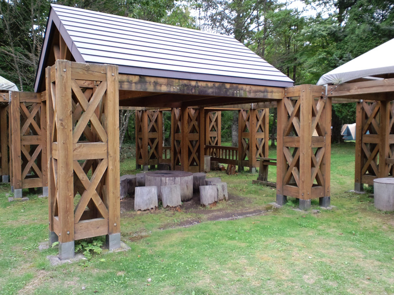 北側のサイトにはこんな感じの四阿がいくつかまとまってあります。雨のときは助かるかも?