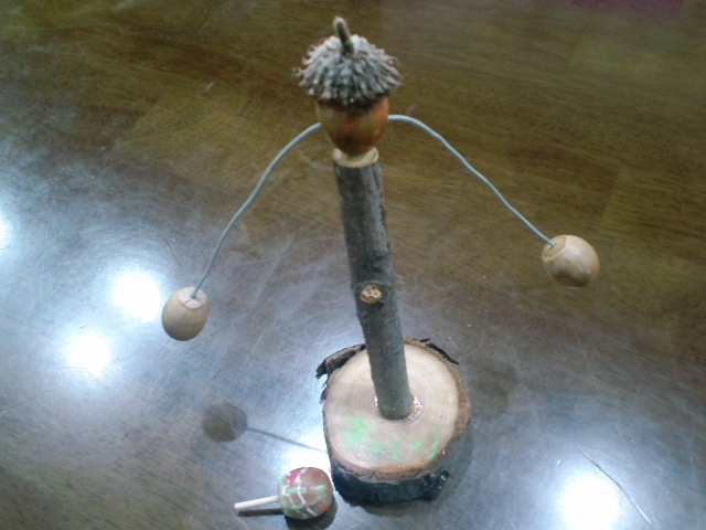 保育園でやじろべえと独楽をドングリで作ってきました。