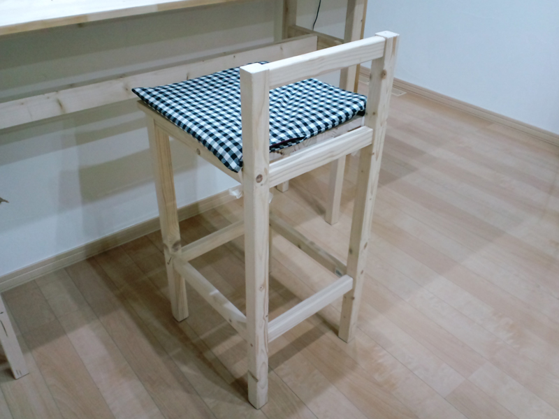 組み立て方はテーブルとほとんど同じです。座面の広さが450×450mm、高さが700mmくらい+200mmの背もたれ。これも組立でほぼ1日かかりましたね。もっと簡単にできるかと思ったんですが意外に時間かかることもわかりました。