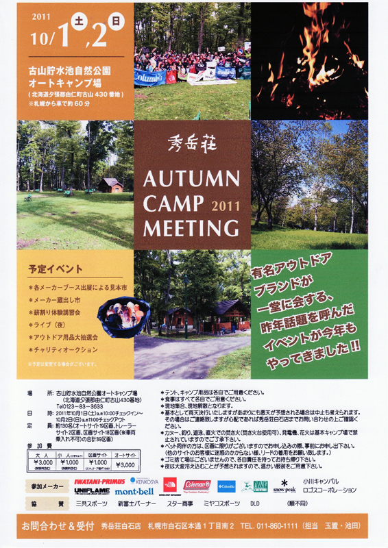 アウトドア各メーカー出店による見本市、メーカー蔵出し市、薪割り体験講習会、アウトドア用品抽選会、など、楽しそうなイベントが満載の模様。
