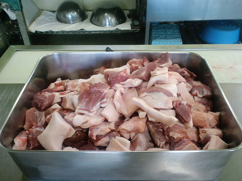 豚ブロック肉を機械に投入しやすいよう、こぶし大に切り分けていきます。