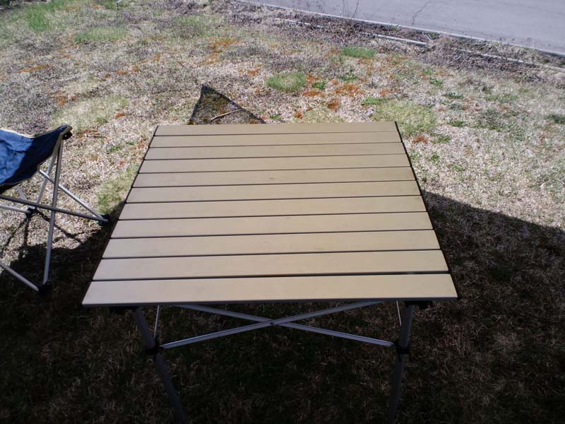 テーブルはこんな感じ▽のですが天板がスノコ状なのでくるくる丸めて、脚は収束して収納できるので