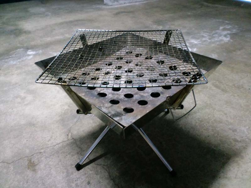 使用時のサイズはメーカー公表値で430mm×430mmとなってますがこれは設置時の最外寸法です。写真を見てお分かりのとおり、網と炉は45°ねじれ た位置で設置となるので、実際に網に火が当たるのはだいたい300mm×300mmくらい、網高は公表値のとおり330mmです。