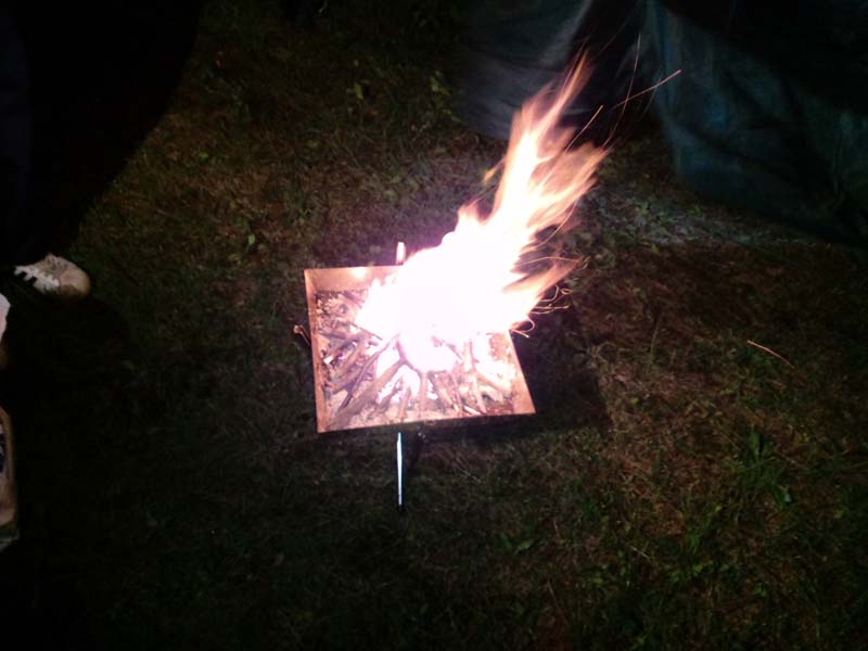 そ してもう一つの良いところ。夜の食事が終わったら、網を外して焚火タイムです。そう、このグリル、そのまま焚火台になるのです。炉の底板が平らな一枚板な ので火がこぼれることはほとんどないです。なので、火避けの下敷きを別に用意する必要はありません。なんか火をボーと眺めていると癒されますね。