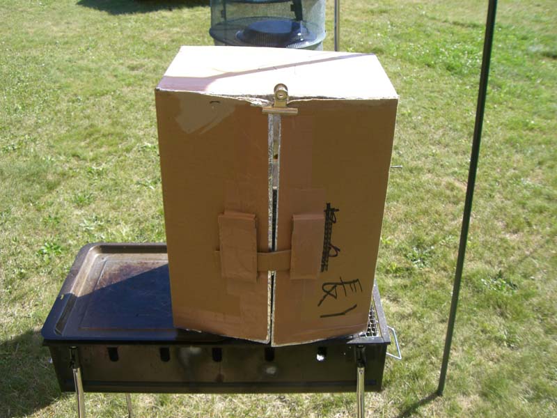 段ボールオーブンは段ボール箱の内側にアルミホイルを張り付け、火にかける裾の部分を取り除きけば出来上がりです。壁から壁へ太めの針金を通し、そこに焼き網などを載せて使います。針金を通す高さで火の距離を調整します。