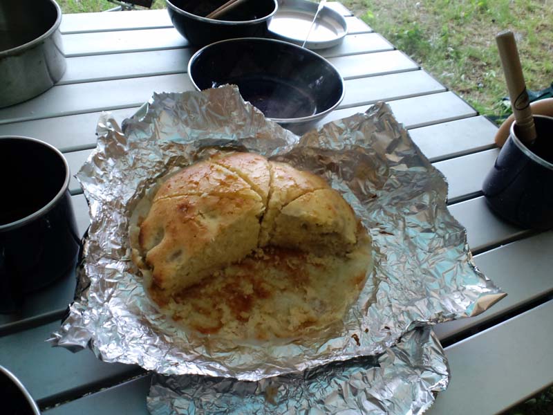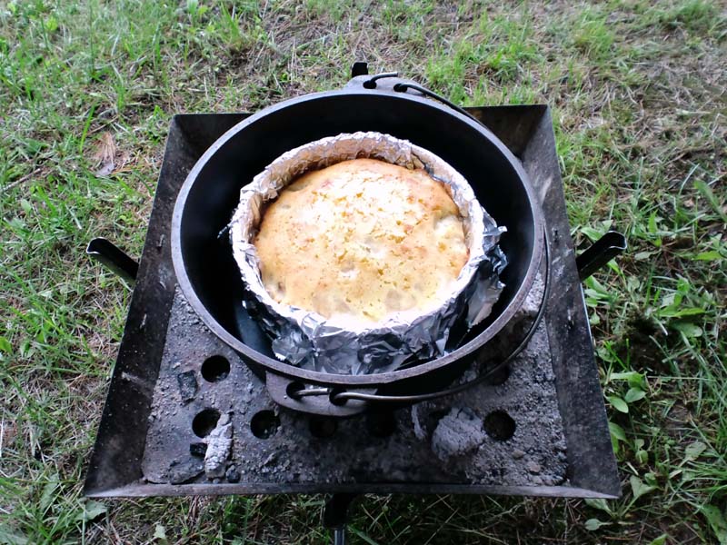 8.温まったダッチオーブンに底網を敷き、その上に材料を入れた型を載せる。底網は忘れずに。直にダッチの底に型を置くとケーキの下だけコゲコゲになっちゃいますので。