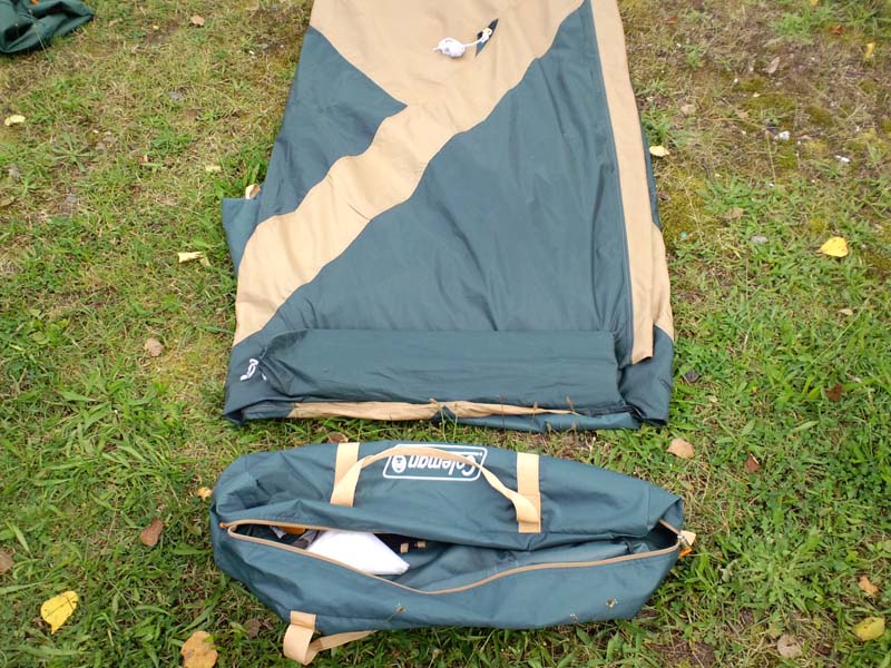 ちなみに袋に収納するときは巻き終わったテントに袋を被せる様にすると楽に入れられます。テントのほうを持って入れようとすると巻いた端がめくれちゃったりするので、、、