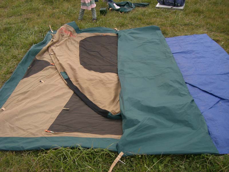 フライの天井側にたたんで袋に収納したポールを載せます。これを芯にテントを巻いていきます。