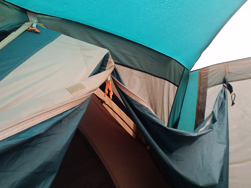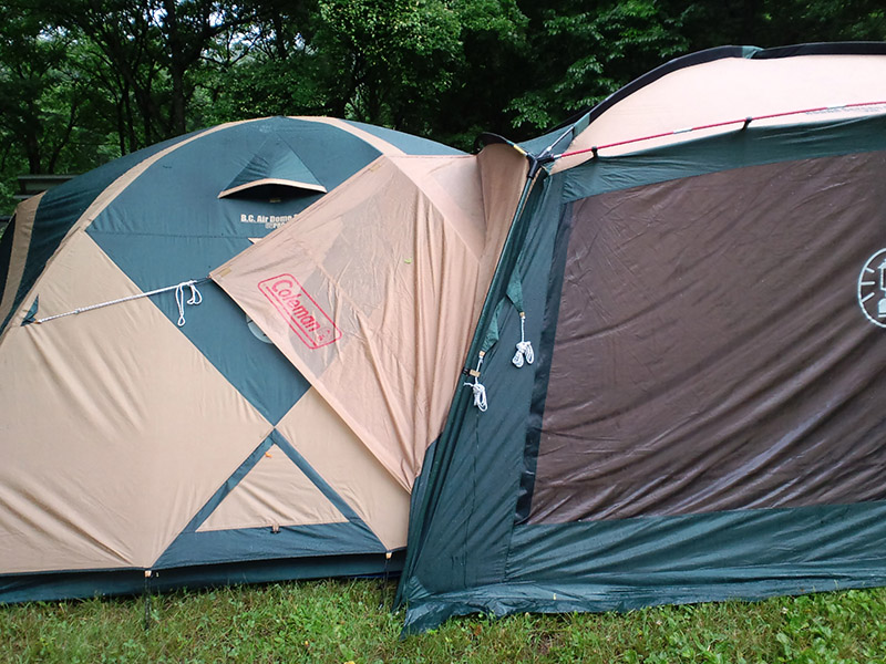 スクリーンの中にテントを差し込む、いわゆる簡易接続というわりと良く見かけるパターンですが雨天時にやっておくといい対策が何点かありますので今回はそのあたりのお話を。