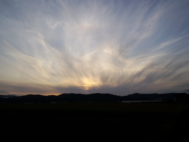 今日は仕事だったんですが、会社からの帰り道に不思議な夕焼け空が見えたので撮影してみました。雲が墨を流した様で綺麗だな~、と思って。